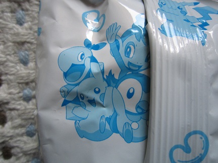 こんな感じの袋にお菓子が入っています。シンオウ御三家はこの袋に印刷されているのみ。なんですかこのディスられ具合・・・HGSSがDPを占領。
