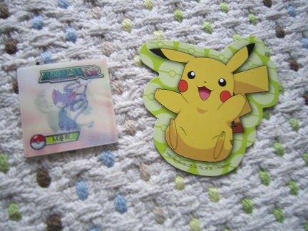 左はニャルマーの傾けると絵が変わるやつです。絵は角度によってブニャットと変わります。右のはよくわかりません(汗)シールになってないから、ピカチュウのステッカーではないんですけど・・・